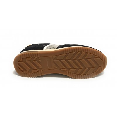 Realizzata in pelle scamosciata colore blu navy, con inserti in pelle traforate e suede.