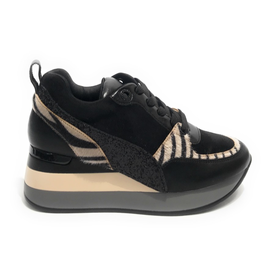 Realizzata in ecopelle di colore nero, con inserti glitter di colore nero e inseri animalier.