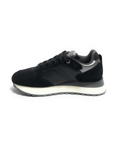 Realizzata in pelle scamosciata, di colore nero, con inserti in ecopelle effetto metallizzato.